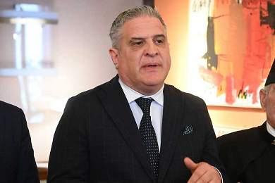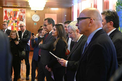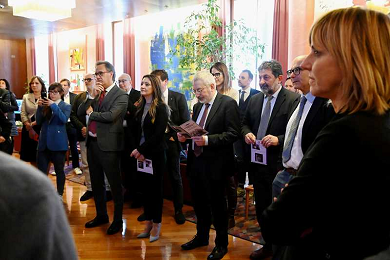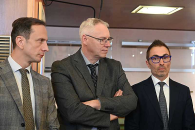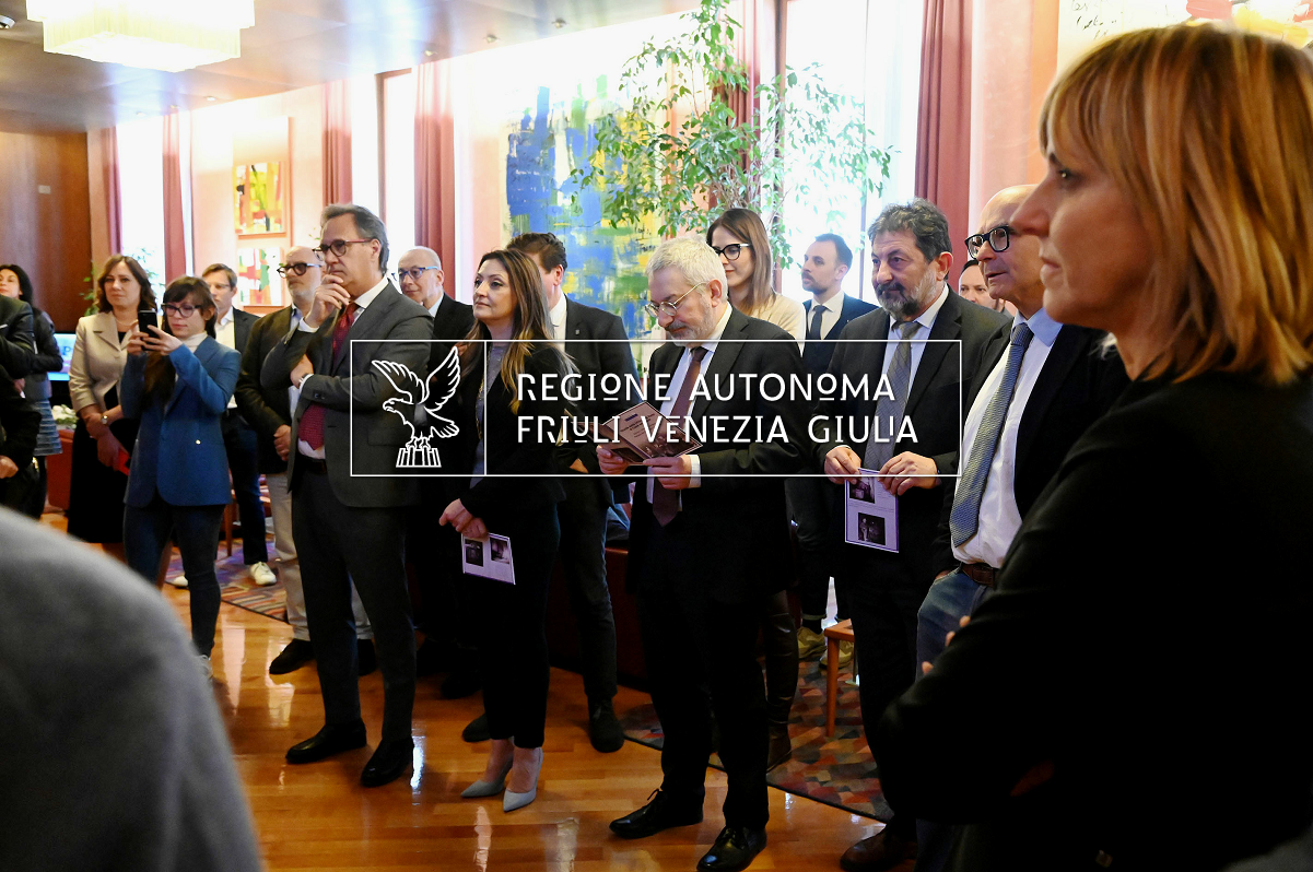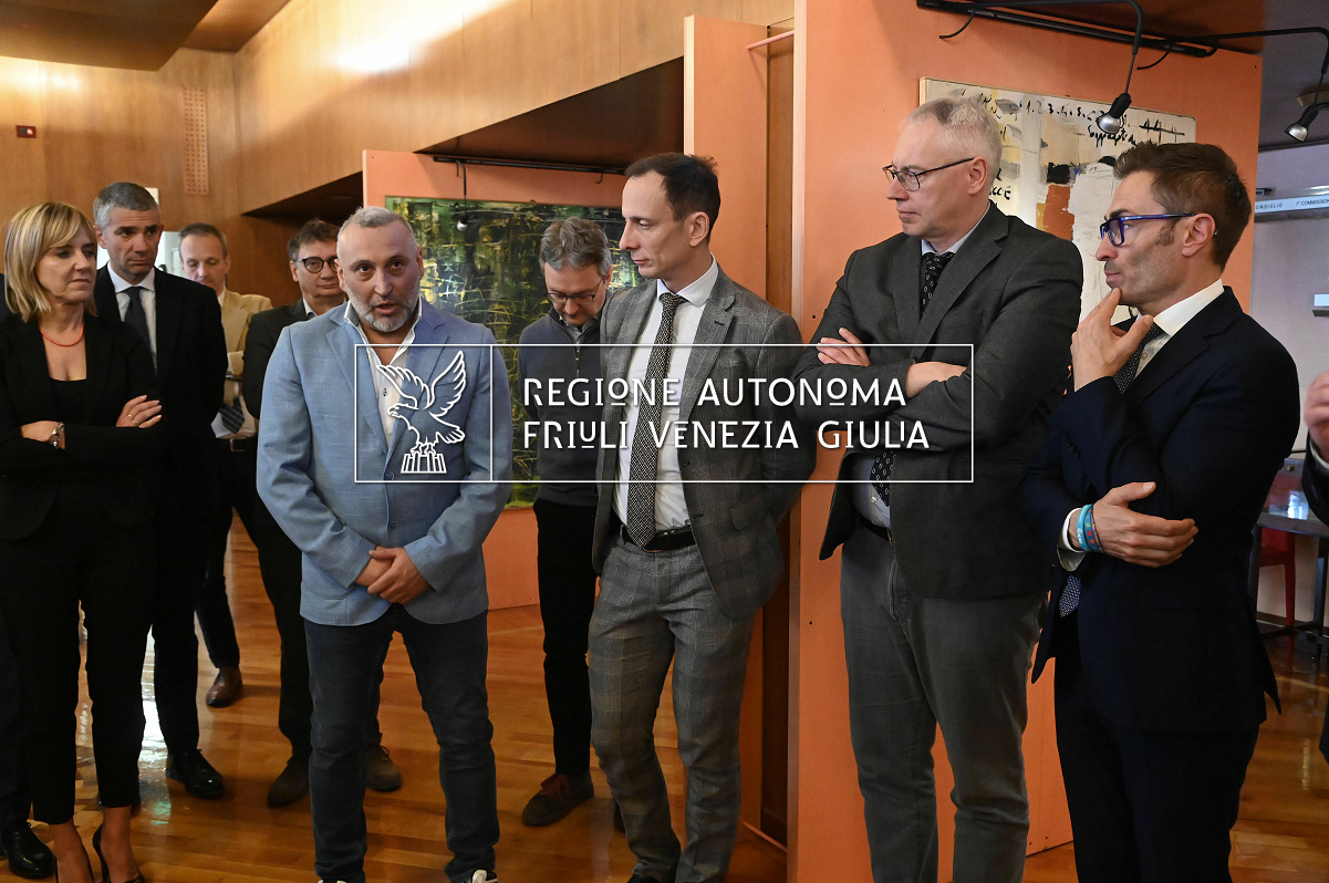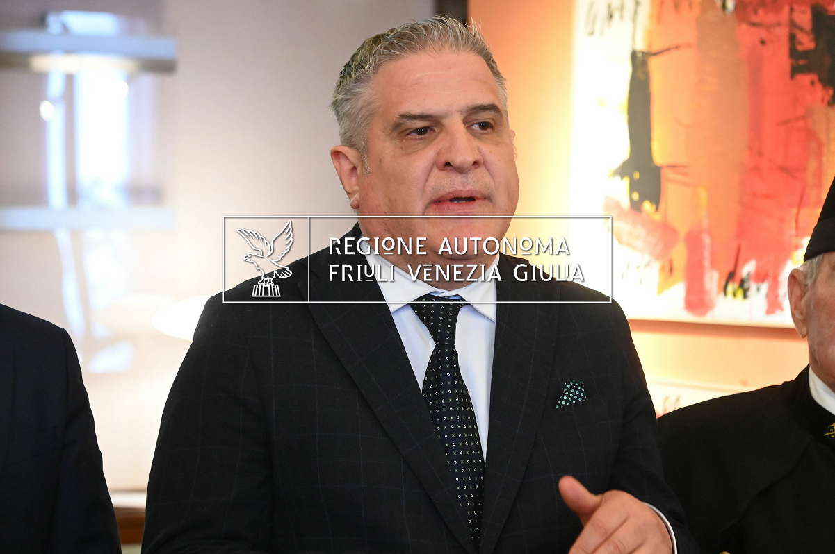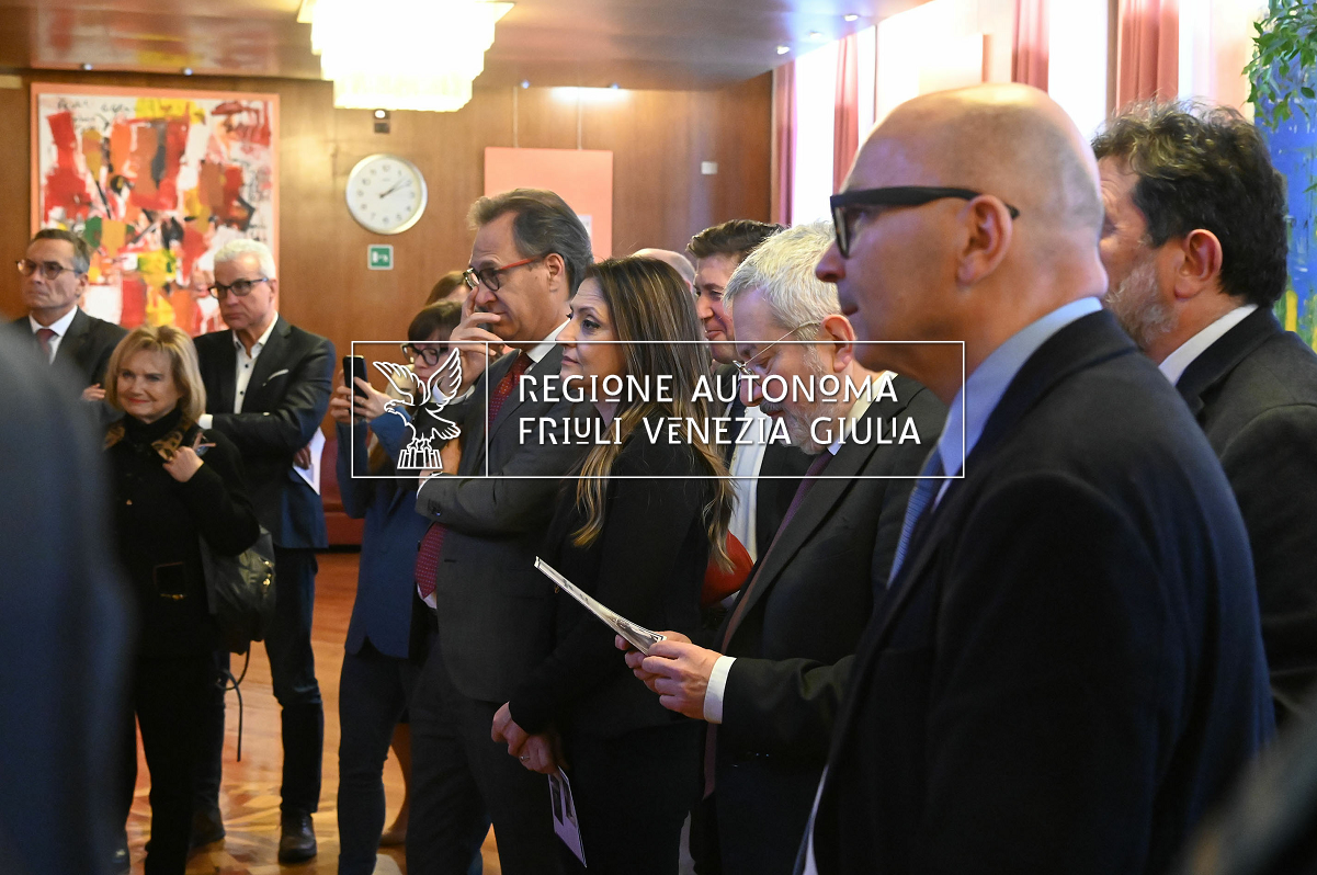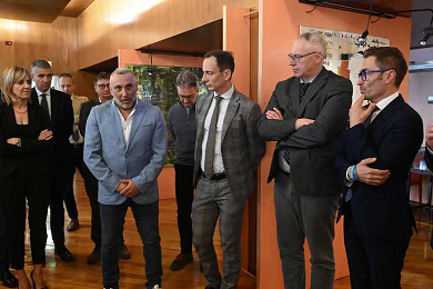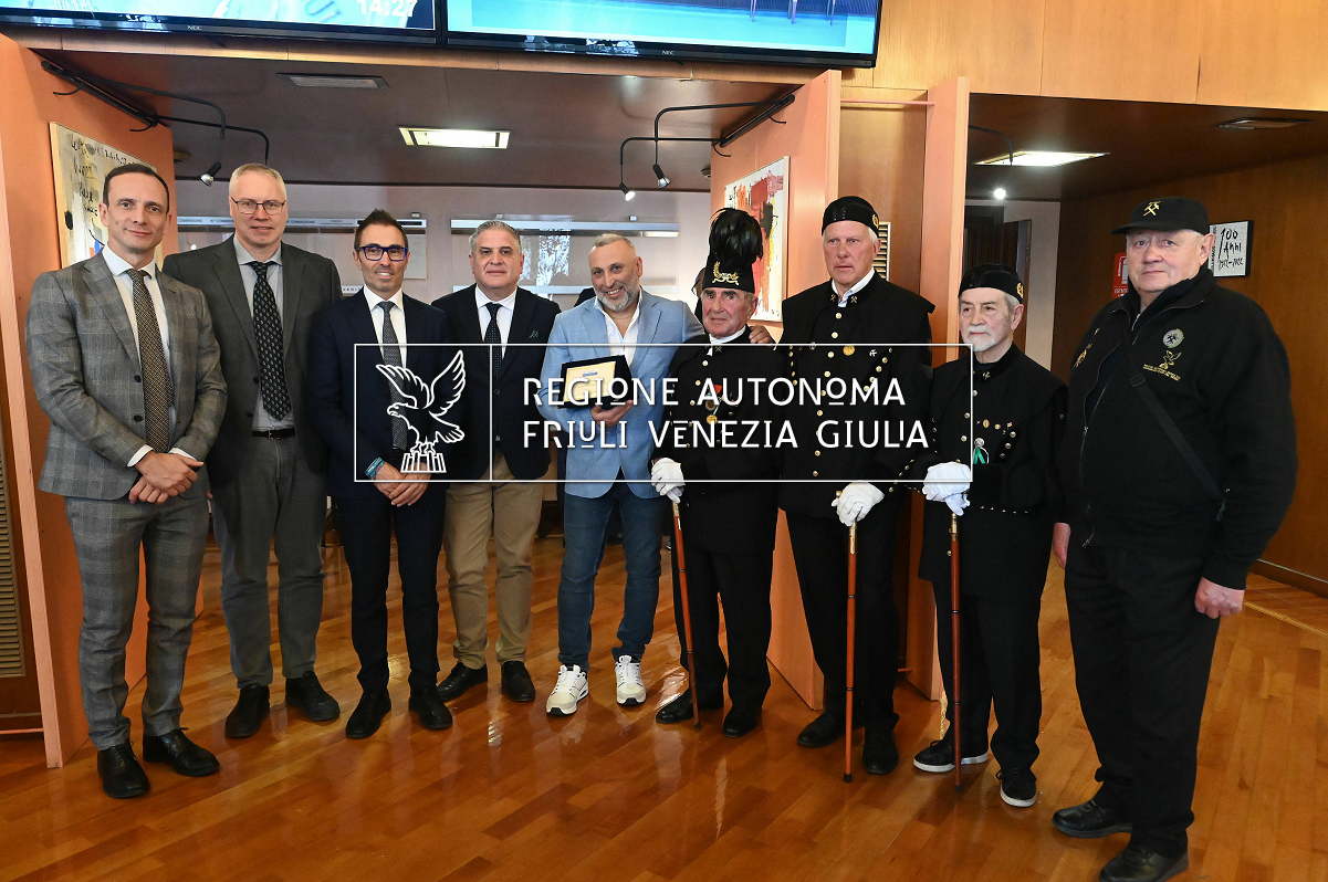 Il presidente di Pluriservizi Valcanale, Giuseppe Divora (primo a sx), con il governatore Massimiliano Fedriga, il presidente del Consiglio regionale, Mauro Bordin, e il suo vice Stefano Mazzolini